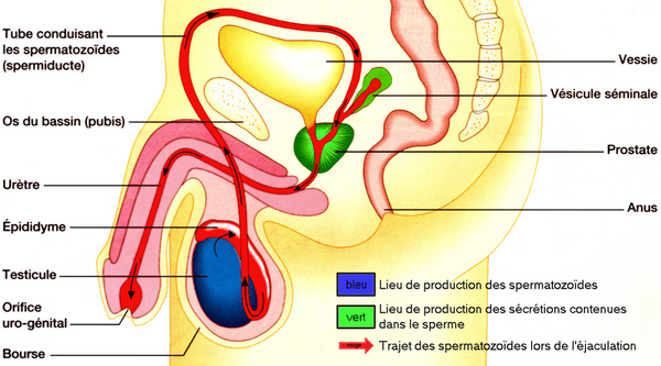 Trajet du spermatozoide dans l'homme. La spermatogenèse ou fabrication du sperme se déroule au sein du testicule dans lépithélium des tubes séminifères en association avec les cellules de Sertoli. Il sert à transporter la moitié des informations génétiques issues du père nécessaires à la fabrication dun nouvel être humain. Pour assurer la fécondation de lovule dans la majorité des cas il sagit de spermatozoïdes provenant dun rapport sexuel à jours avant lovulation.